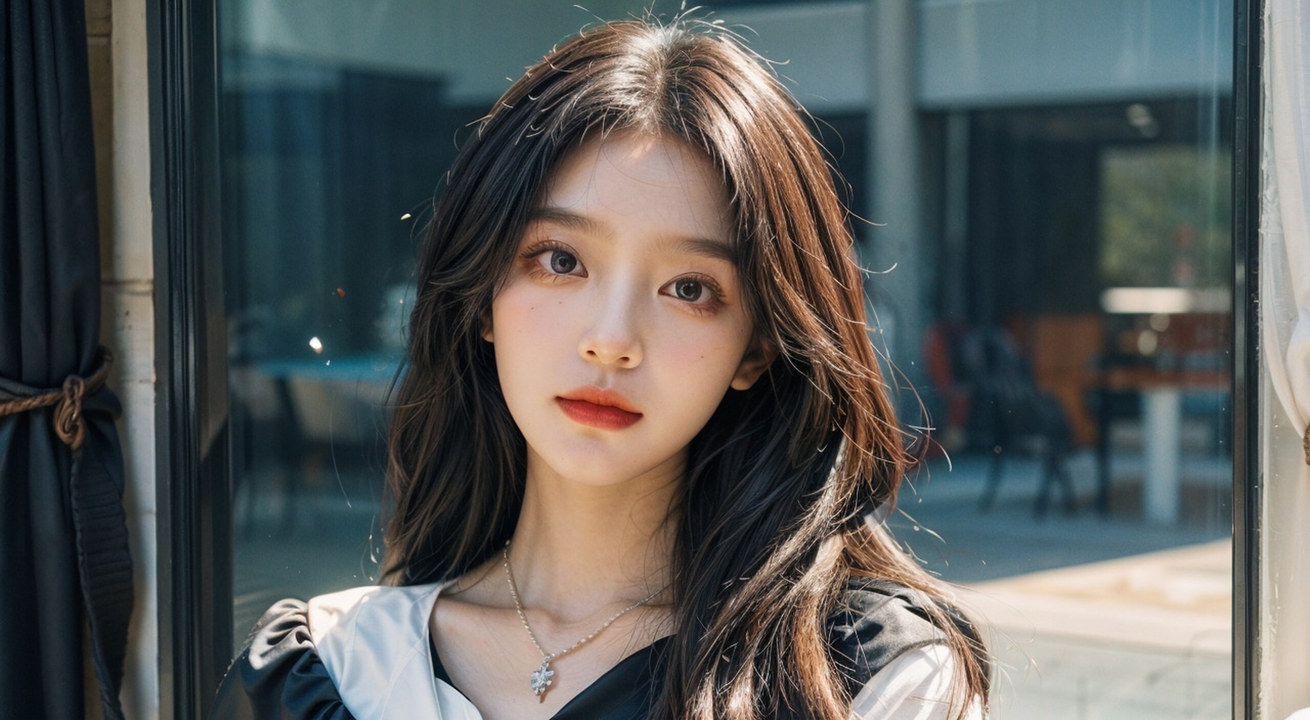 一位极品精致真人美少女,黑色长卷发极品精致五官端正,绝世美少女,,黑色连衣裙,一脸严肃,柔软,梦幻般的品质,浅白色和深棕色,夸张的五官,纯色,坦率的米白色,超现实,蓝色的宝石项链,超清,美丽年轻女孩,可爱活泼,黑色连衣裙,背景在窗边,面对镜头