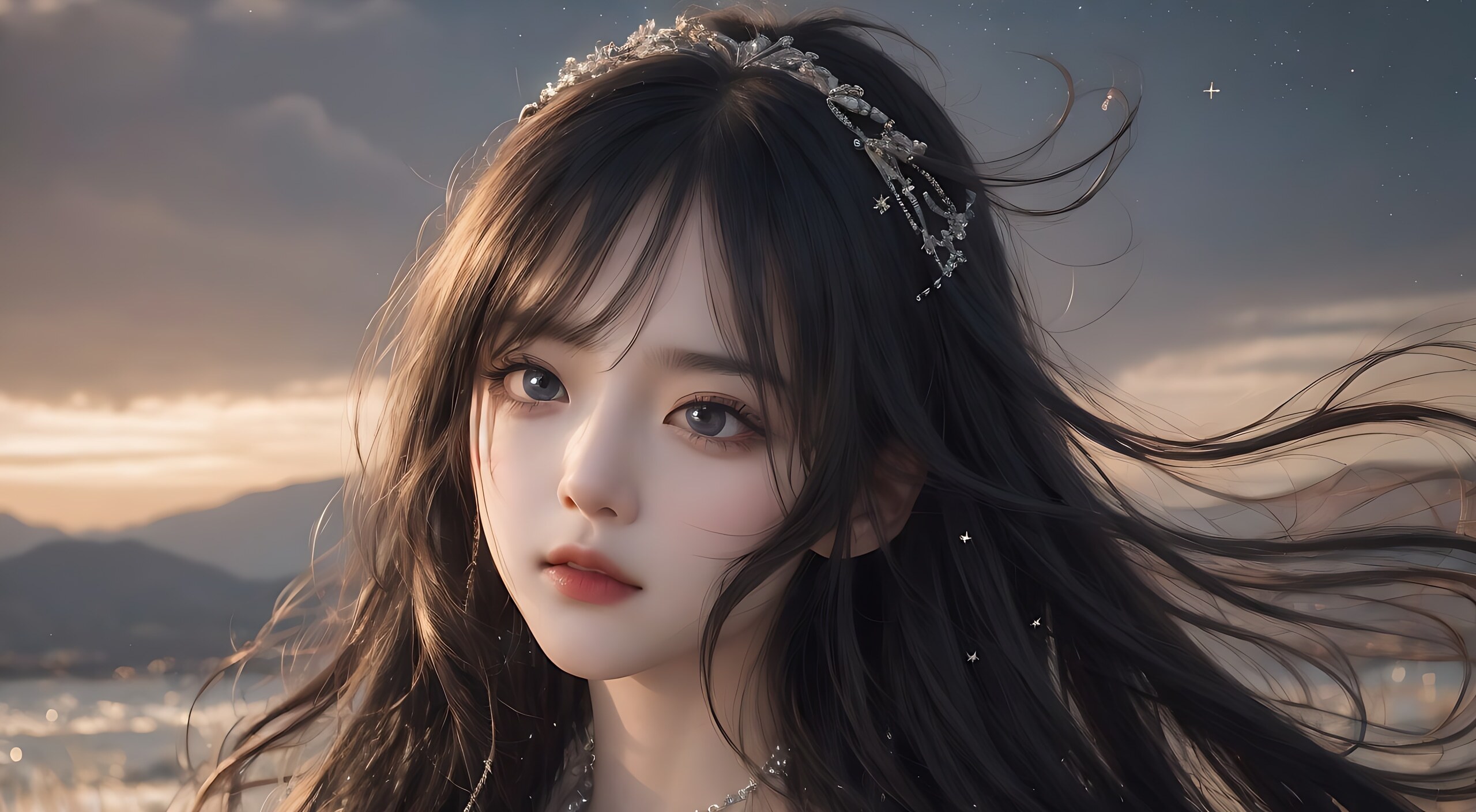 pixiv艺术品,帅气的女孩,鹅蛋脸,大眼睛,长睫毛,有刘海,酷帅,霸气,精美的(真人写实风格),极致脸蛋,照片级光影,星星般的眼睛,披着零散黑色长发及腰,(头发飘逸)闪闪发亮的首饰,(黑色星空背景),上半身背景,穿着黑色婚纱,肩,背,面对镜头,美丽,极高的质量,电影级画面,高质量CG,8K分辨率。