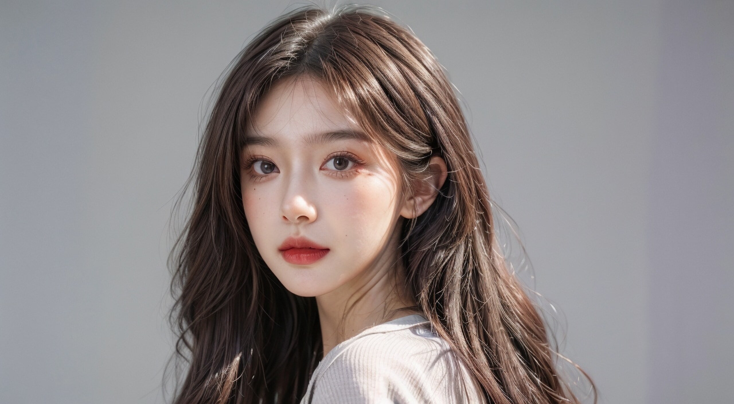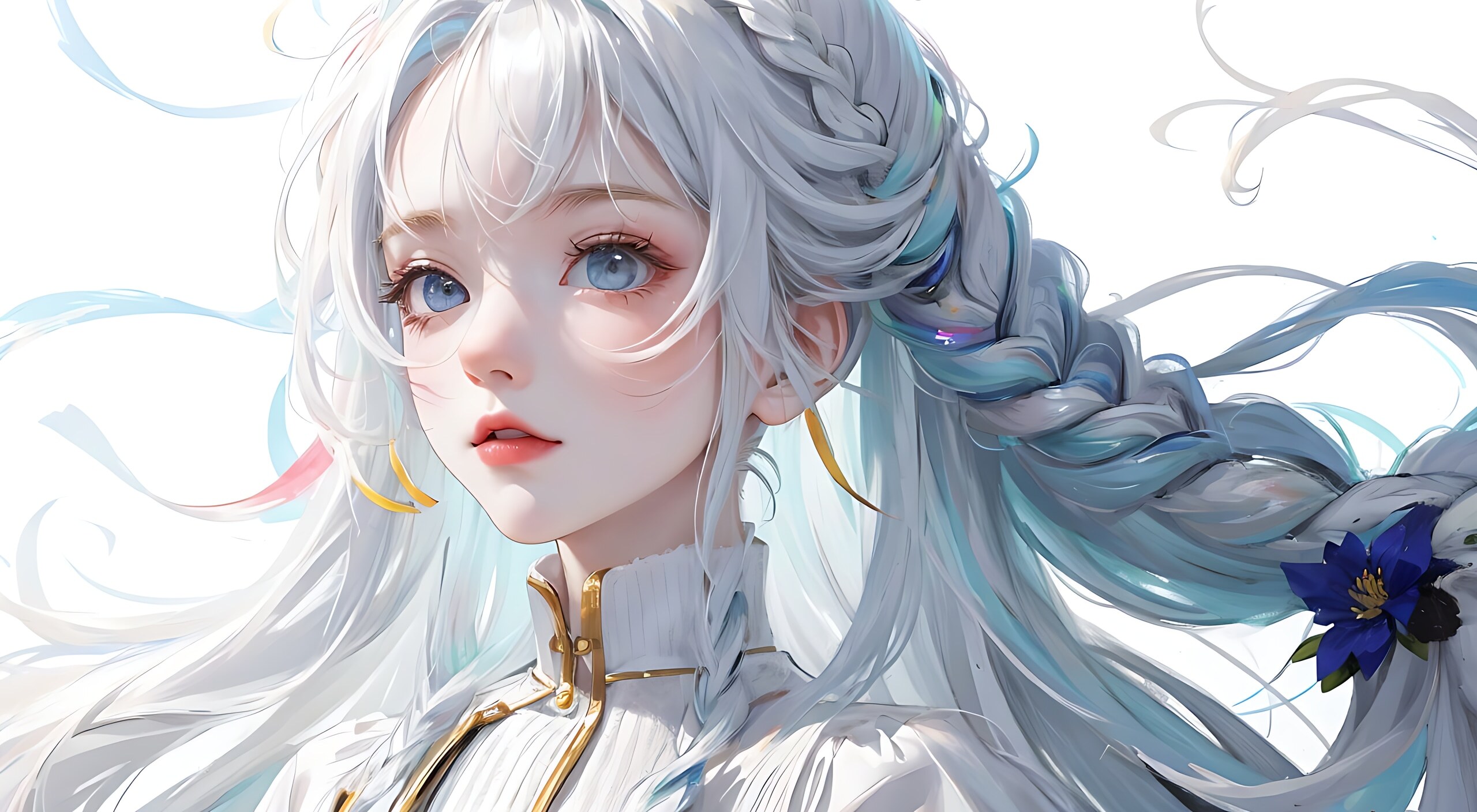 纯白色背景,七彩的头发,长发,彩色的编发,-个女孩,solo,最高品质看着镜头,淡蓝色眼睛,((头发的发丝)),锁骨,宽松的衬衫,甜酷,可爱表情,可爱耳饰,((彩虹色背景),最高画质,8k,正面打光