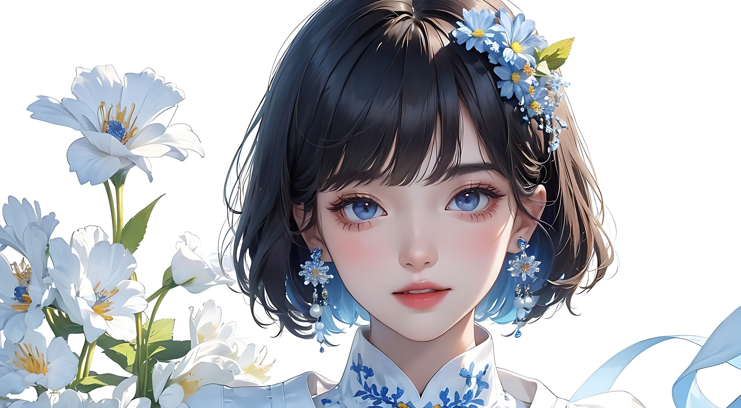 8k分辨率,精致的五官,五官端正,整齐的牙齿,完美的脸,发光皮肤,齐刘海,短发,高细节,更高质量,元气少女,高级脸,化淡妆,薄薄的嘴唇,长长的睫毛,((白底蓝花旗袍)),三分之二的半身,精致的吊坠,红色耳环